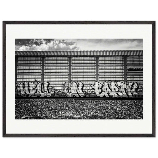 "Hell On Earth;" Train Car Graffiti, Livingston, Montana Black & White Premium Wooden Framed Print With Museum-Quality Matte Paper