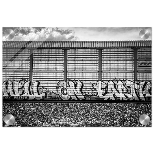 "Hell On Earth;" Train Car Graffiti, Livingston, Montana Black & White Acrylic Print