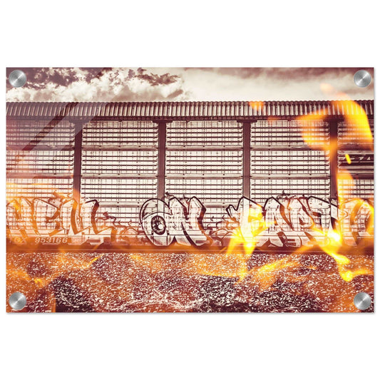 • "Hell On Earth W/ Fire;" Train Car Graffiti, Livingston, Montana Acrylic Print Communitea Books James Bonner