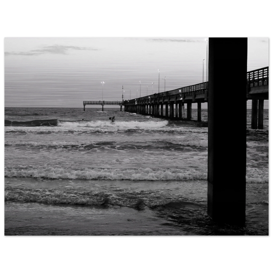 Surfing & Pier W/ Illuminated Lights; Port Aransas, Texas Black & White Brushed Aluminum Print