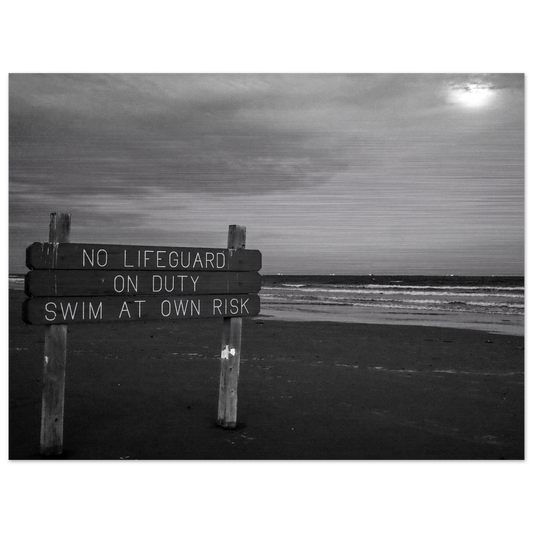 "No Lifeguard On Duty;" Port Aransas, Texas Black & White Brushed Aluminum Print