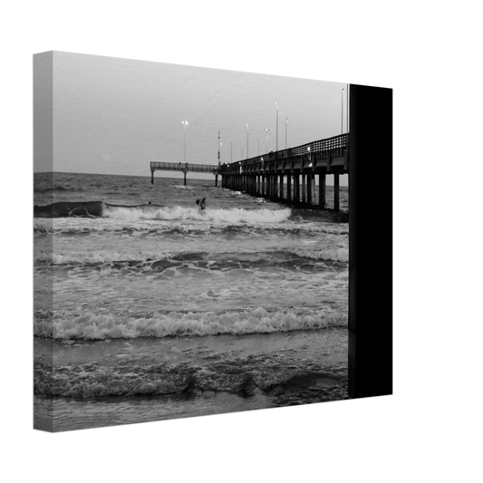 Surfing & Pier W/ Illuminated Lights; Port Aransas, Texas Black & White Canvas
