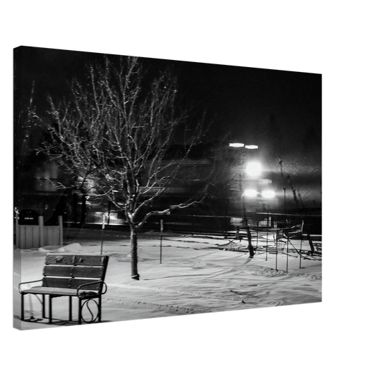 Train Passes a Wintery Park; Livingston, Montana Black & White Canvas
